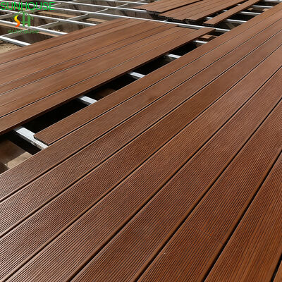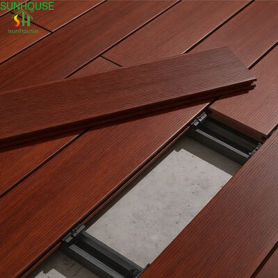 De oppervlakte textuur wordt aangebracht via een driefasig afwerkingsproces dat 3D-reliëf, schuren en borstelen combineert. Deze gelaagde aanpak produceert een oppervlak dat zowel visueel als onder de voeten aanvoelt als natuurlijk hout, met voldoende microtextuur om grip te behouden in natte omstandigheden. HDPE-hars en UV-stabilisator additieven worden in het planklichaam gemengd voordat ze worden geëxtrudeerd — weersbestendigheid en kleurstabiliteit zijn ingebouwd in de materiaalstructuur, niet afhankelijk van oppervlaktebehandelingen die na verloop van tijd degraderen.